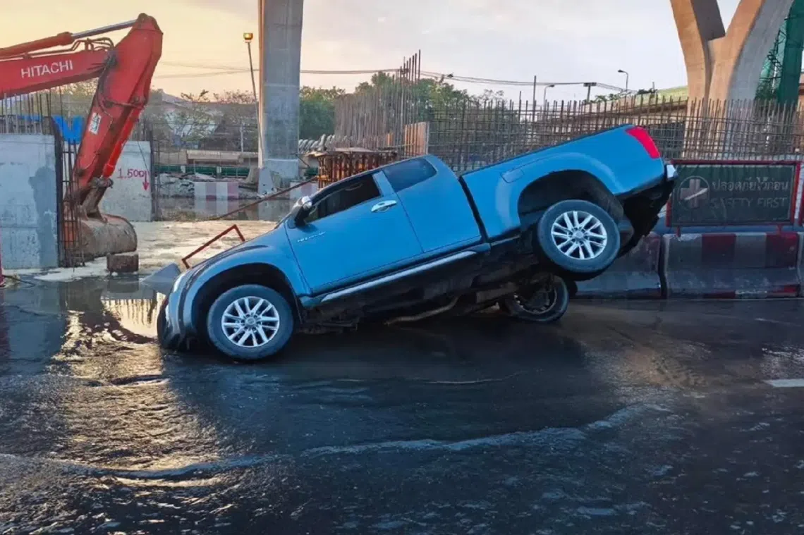 A pick-up truck plunged into a sinkhole created by a sudden road collapse on the parallel lane of Rama II Road on Jan 17.