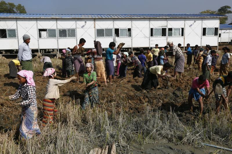 Labourers work at the repatriation project construction site for Rohingya refugees near the Taungpyo Bangladesh-Myanmar border gate in Maungdaw district, Rakhine State, Myanmar, on Jan 24, 2018.
