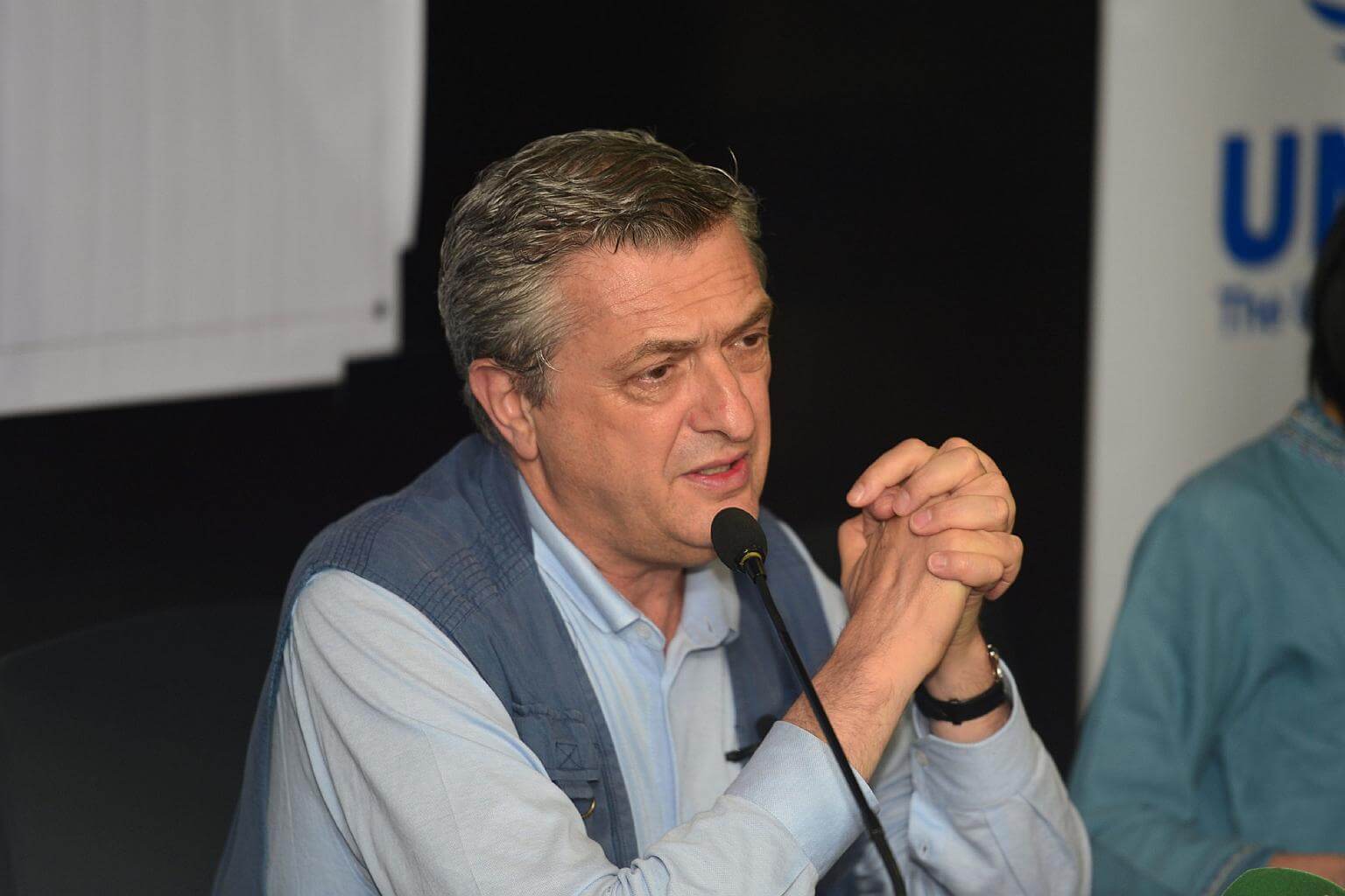 United Nations High Commissioner for Refugees Filippo Grandi speaking at a press conference in Dhaka, on July 10, 2017.