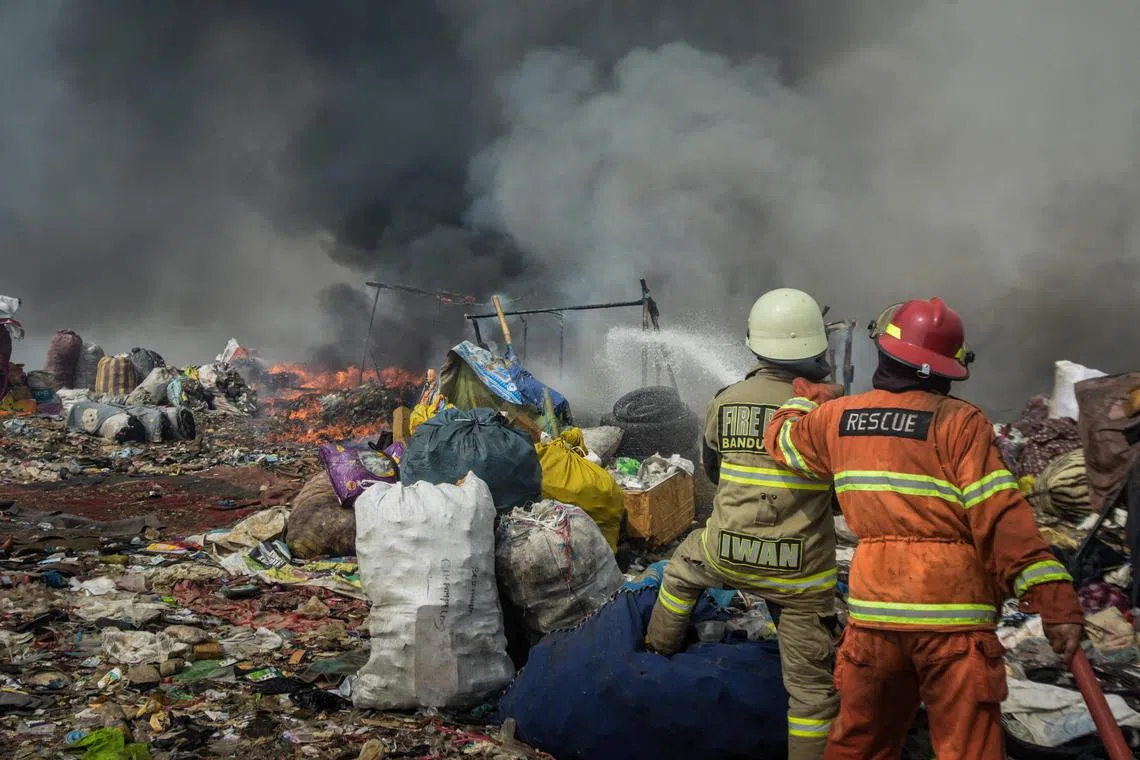 Firefighters trying to extinguish a fire that has been burning for several days at the landfill in Sarimukti on the outskirts of Bandung, West Java, on Aug 24.