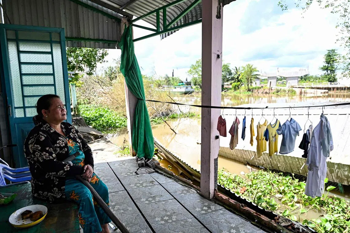 Ms Le Thi Hong Mai sitting near the site where her house collapsed into the Hau river. She laments that she “lost everything”, including the small restaurant business attached to her house.