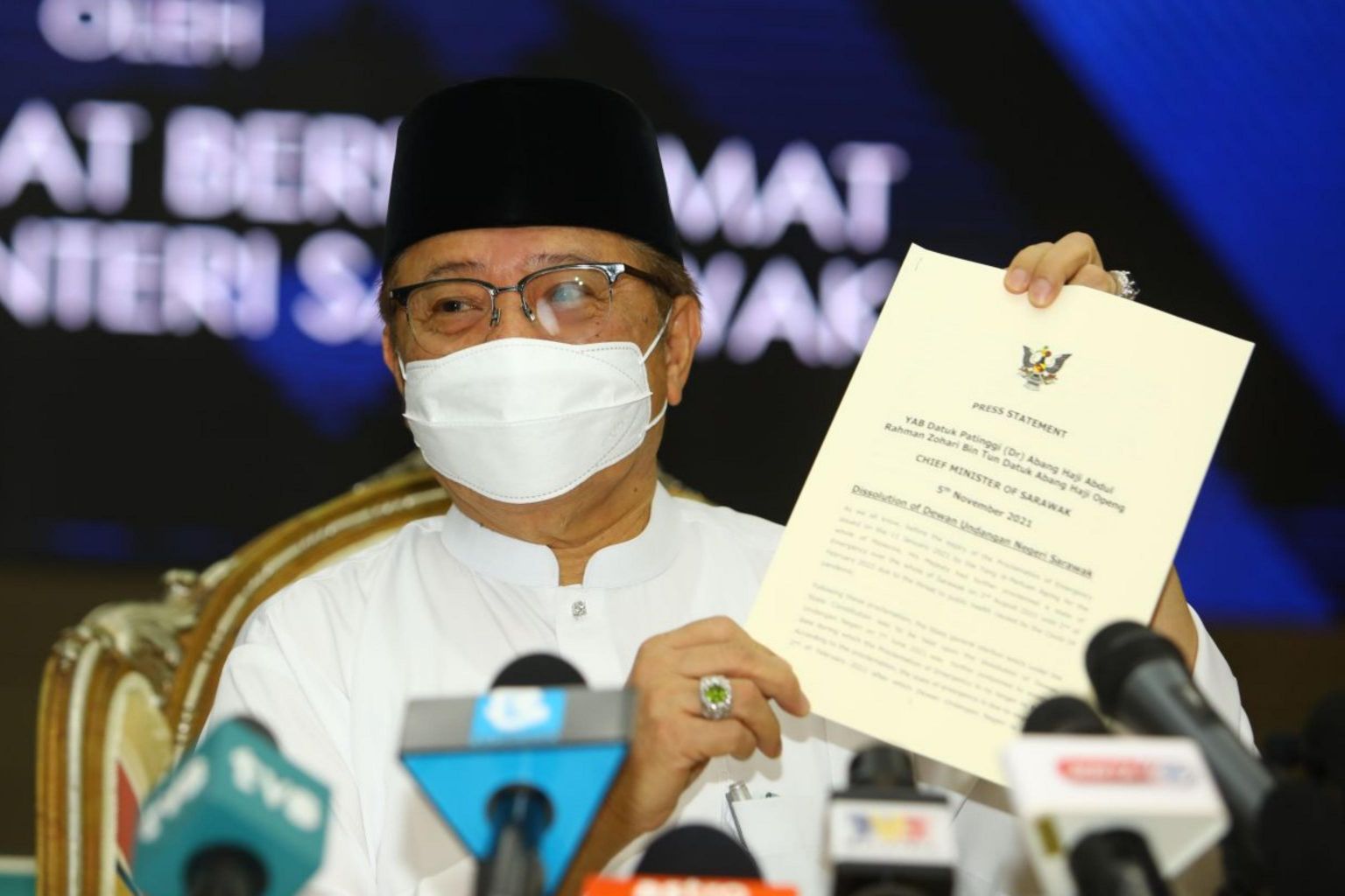 Chief Minister Abang Johari Tun Openg announcing the dissolution of the Sarawak state legislative assembly in Kuching on Nov 5, 2021.