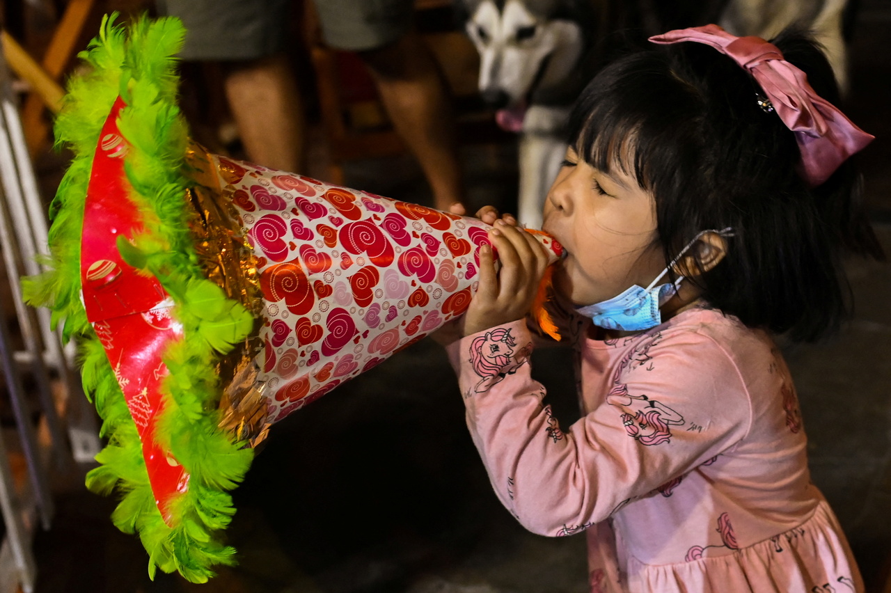 A child blows a trumpet during the New Year's Eve countdown in Quezon, Philippines, on Dec 31, 2021.