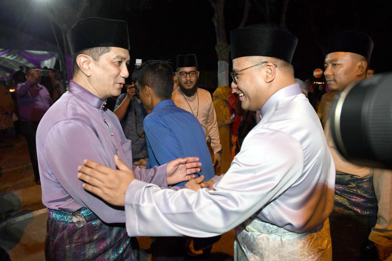 In this picture taken on June 30, 2019, PKR deputy president Datuk Seri Azmin Ali greets Selangor Menteri Besar Amirudin Shari at a Hari Raya event in Putrajaya.