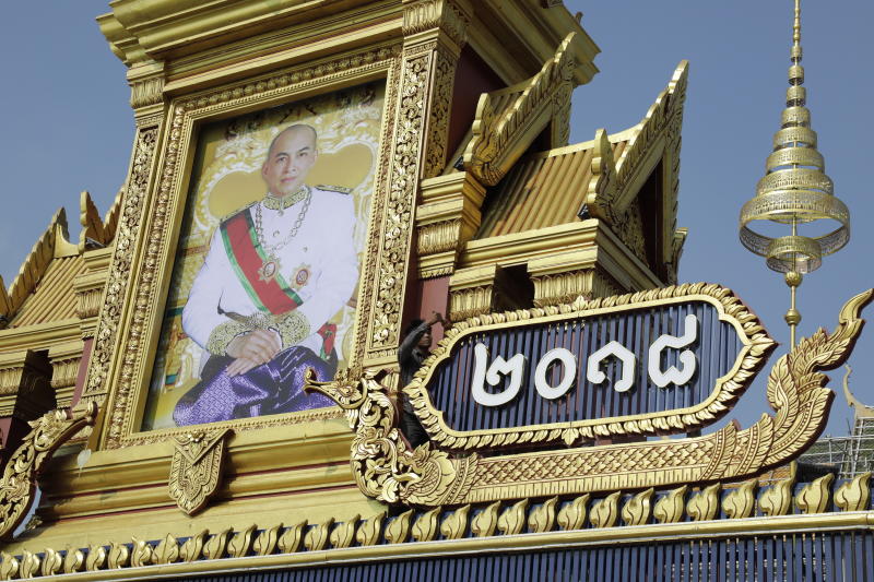A worker paints next to a large portrait of Cambodia's King Norodom Sihamoni in front of the Royal Palace in Phnom Penh on May 12, 2018.