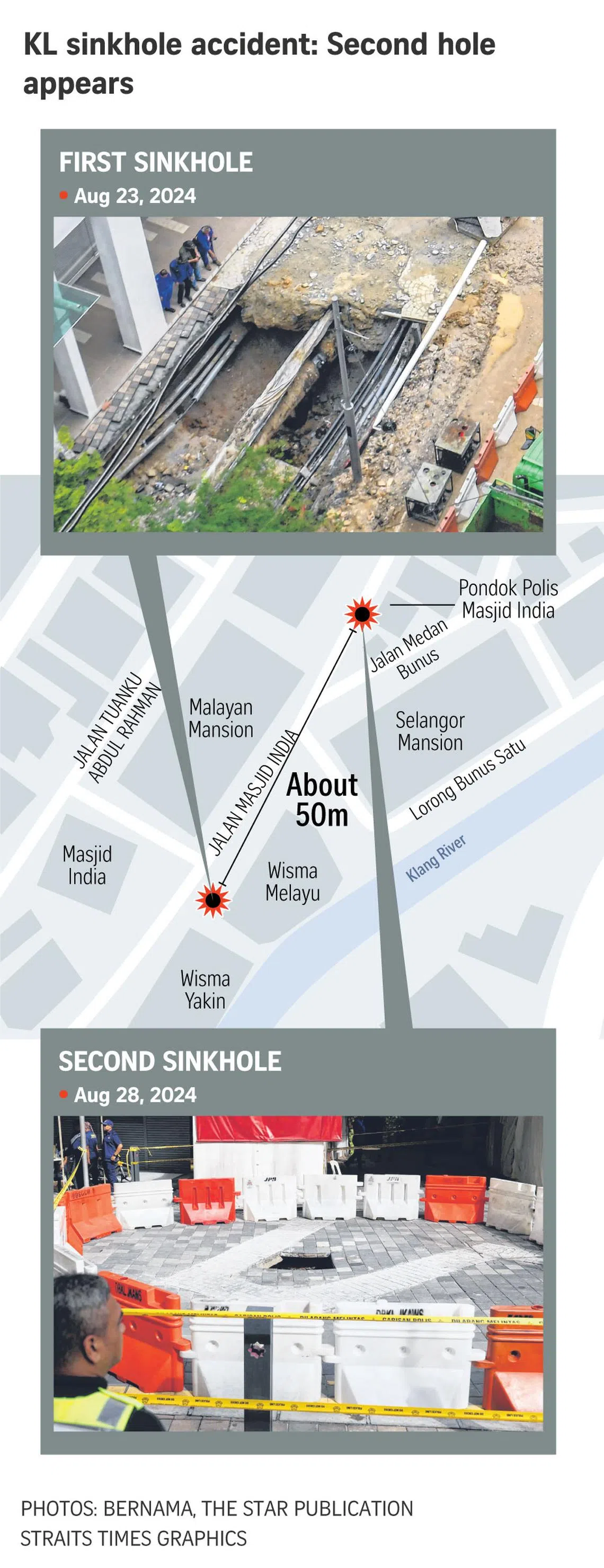 KUALA LUMPUR – A second sinkhole has appeared in Kuala Lumpur’s Jalan Masjid India – just 50m from where the ground opened up on Aug 23 and swallowed an Indian tourist – heightening fears about the safety of the popular area.