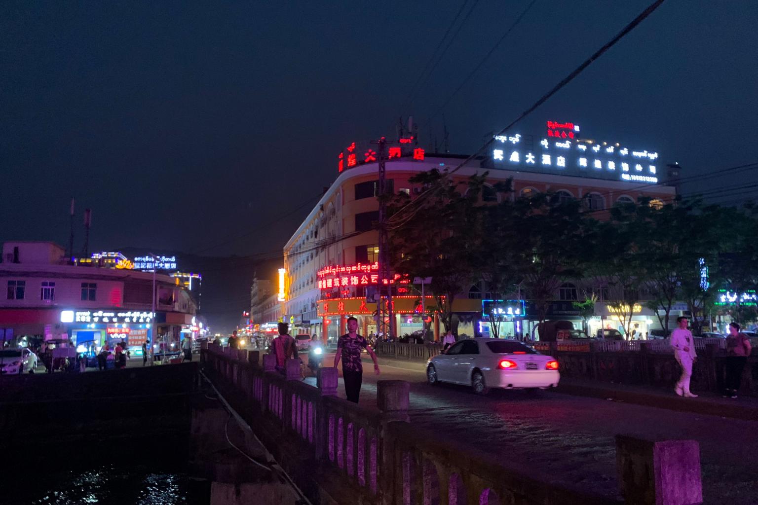 As night descends on the quiet streets of Panghsang, pockets of pink light illuminate the gloom - emitted from the countless Chinese-branded massage parlours dotting the roads.