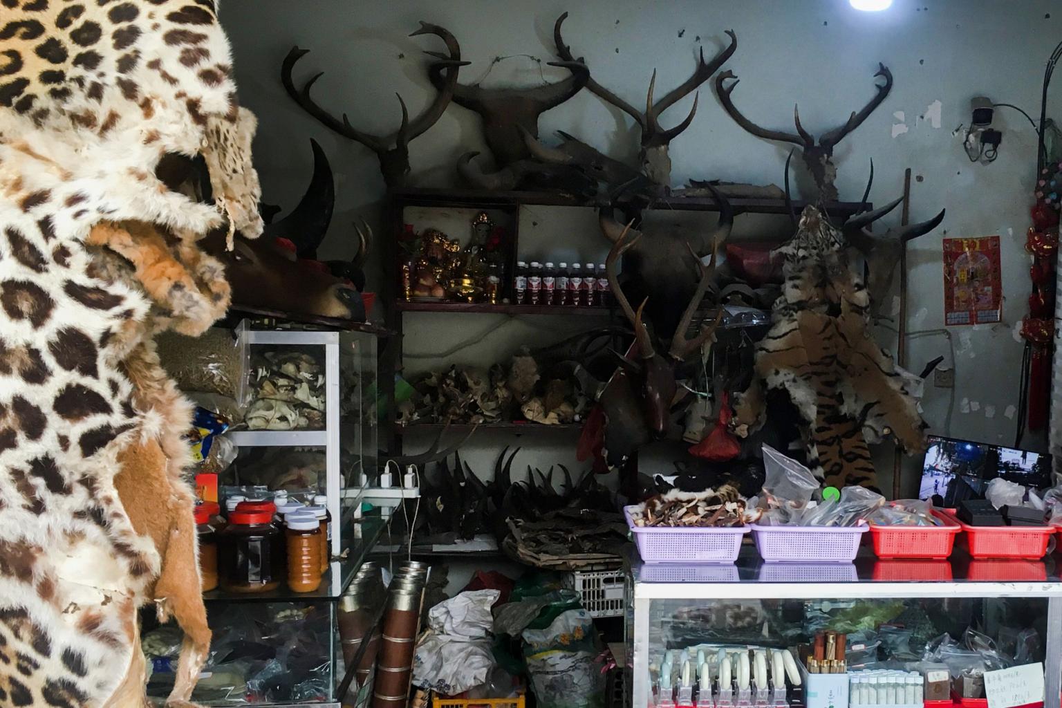 Tiger and leopard pelts are piled up in full view at streetside shops which also displaying ivory, pangolin scales and stacked cages of rare birds.