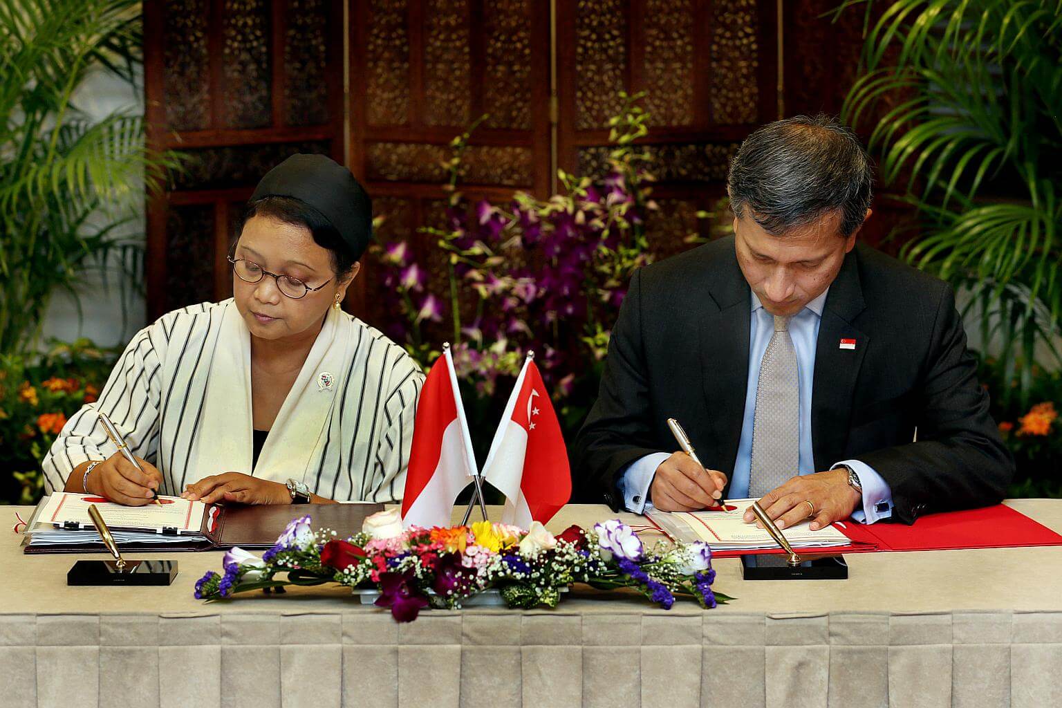 Indonesian Minister for Foreign Affairs Retno Marsudi (left) and Foreign Minister Vivian Balakrishnan at the signing ceremony and exchange of the Instruments of Ratification for the Treaty, on Feb 10, 2017.