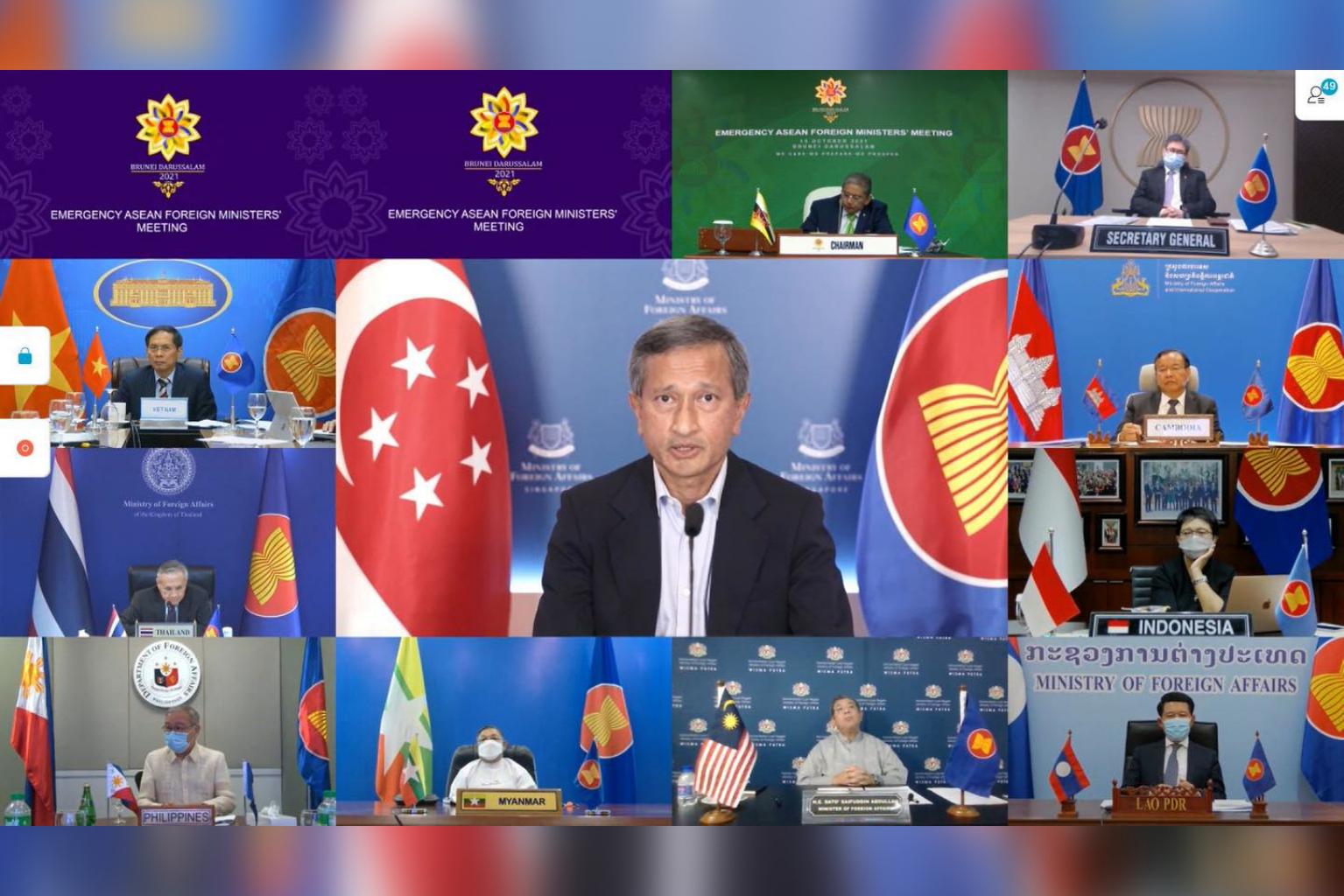 A screengrab from the emergency meeting of Asean foreign ministers on Oct 15, 2021.