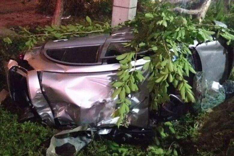 The accident scene in Chiang Mai. Singaporean Joshua Tan Xing Hao crashed his car into a tree in Chiangmai-Prao Road at around 3.40am local time on March 30.