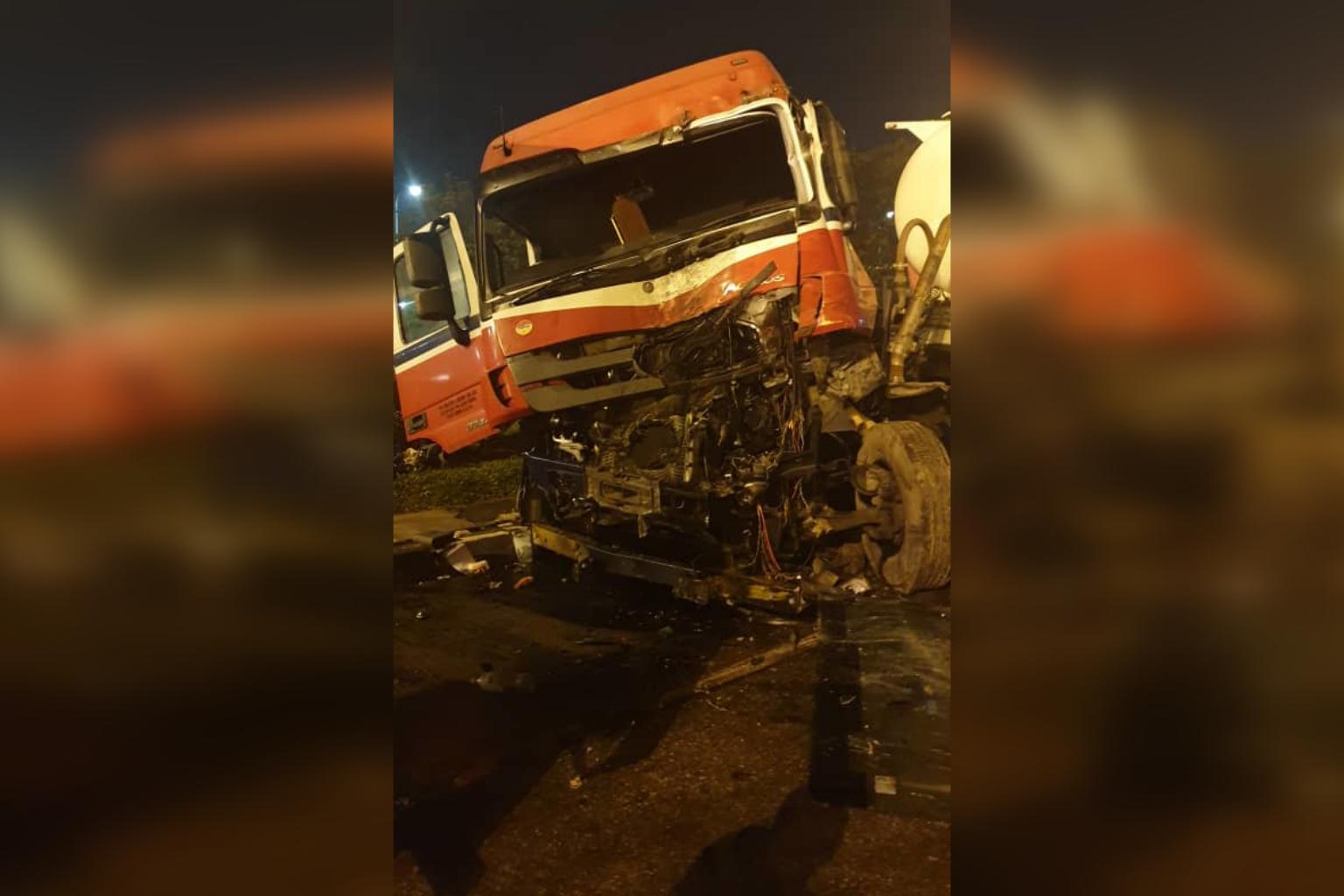 The cement mixer driver was believed to have lost control of the vehicle on the slippery road after a heavy rain as it was turning into the Sungai Buloh Lay-by. It slammed into the bus before crashing into two stationary trailer trucks on the side of the road.
