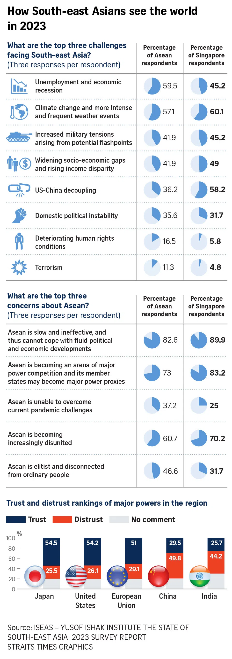 The findings, published in the ISEAS – Yusof Ishak Institute’s The State of South-east Asia 2023 report, indicated that 59.5 per cent of the 1,308 survey respondents polled across the 10 Asean member states ranked unemployment and economic recession as a more pressing concern than climate change – the second-biggest challenge at 57.1 per cent.