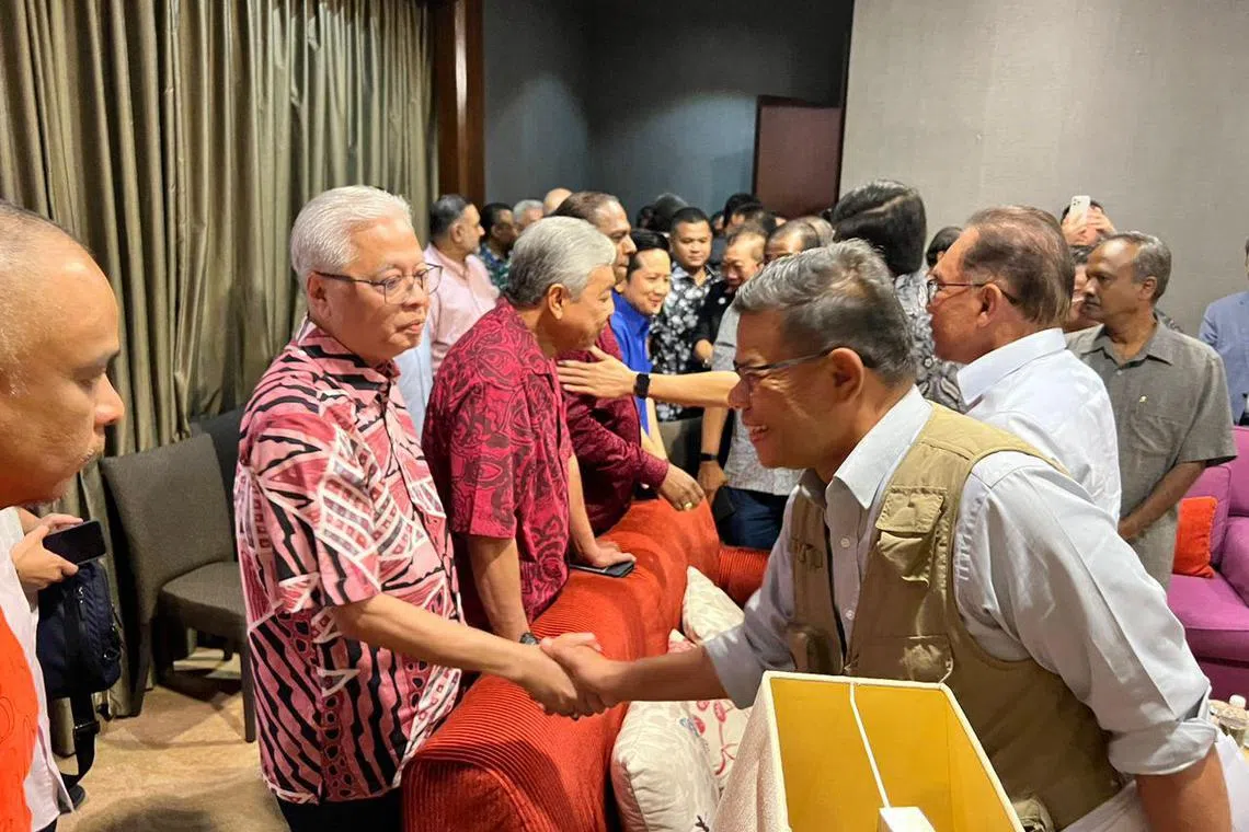 (From left) Former Malaysia PM Ismail Sabri Yaakob and Mr Ahmad Zahid Hamidi meet Pakatan Harapan leader Anwar Ibrahim, in Kuala Lumpur, on Nov 21, 2022.