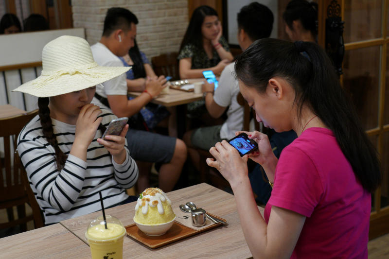 A tourist takes a picture of "Durian Sticky rice kakigori" at a dessert cafe in Bangkok on May 3, 2018.