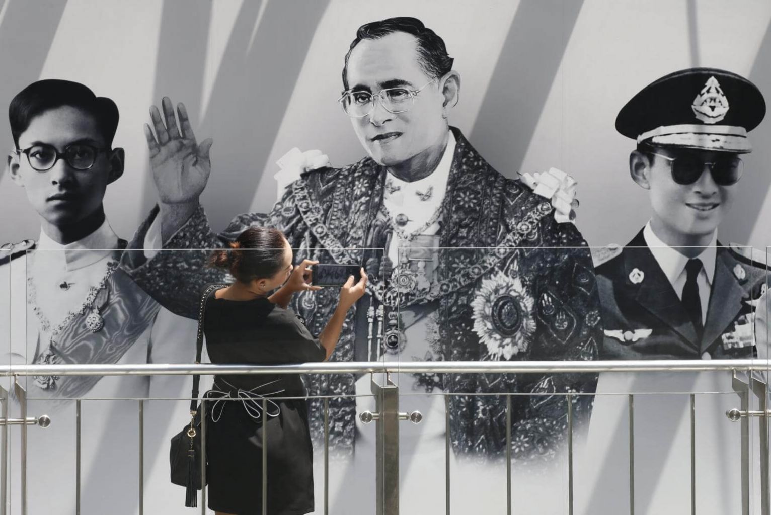 A Thai woman takes a photograph of portraits of the late Thai King Bhumibol Adulyadej on display in front of a shopping center in Bangkok, Thailand, on Oct 19, 2017.