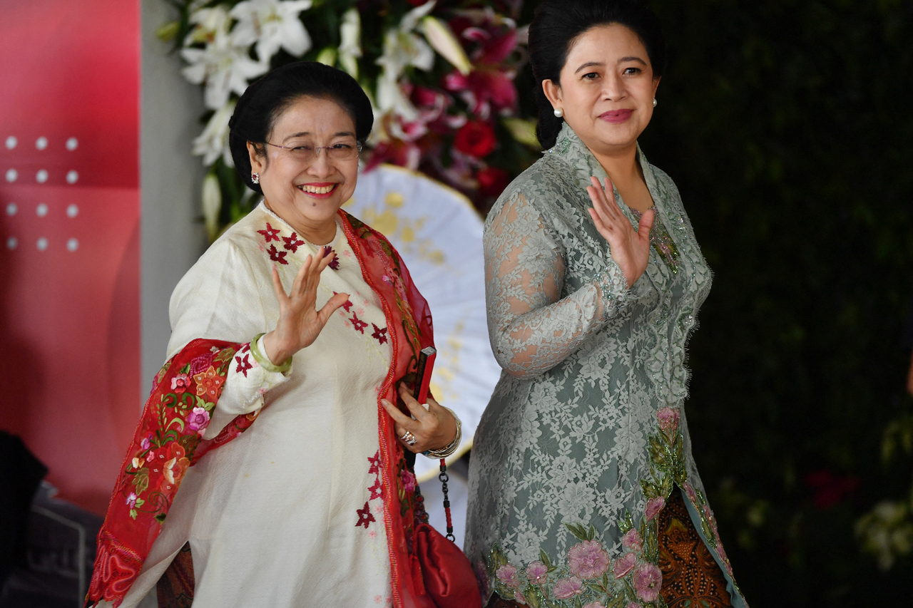 In this photo taken on Oct 20, 2019, former Indonesian president Megawati Sukarnoputri (left) and her daughter Puan Maharani gesture to journalists at the parliament building in Jakarta.
