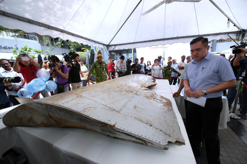Former Malaysian transport minister Anthony Loke Siew Fook looks at the wing fragments of the missing plane on display.