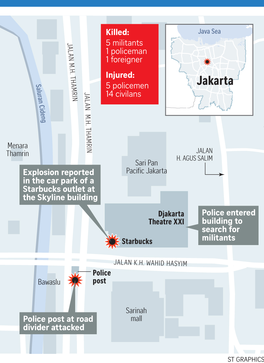 Explosions ripped through central Jakarta, killing several people in the worst attack in the Indonesian capital since 2009.