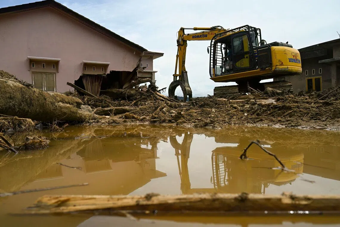 A heavy equipment vehicle removing logs from the vicinity of residents’ houses damaged by a flash flood in Garoga, North Sumatra, on Dec 4.