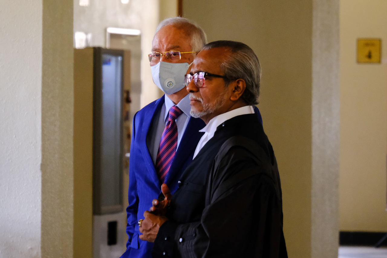 Former Malaysian prime minister Najib Razak with his lawyer Muhammad Shafee Abdullah at Kuala Lumpur Courts Complex on May 19, 2020.