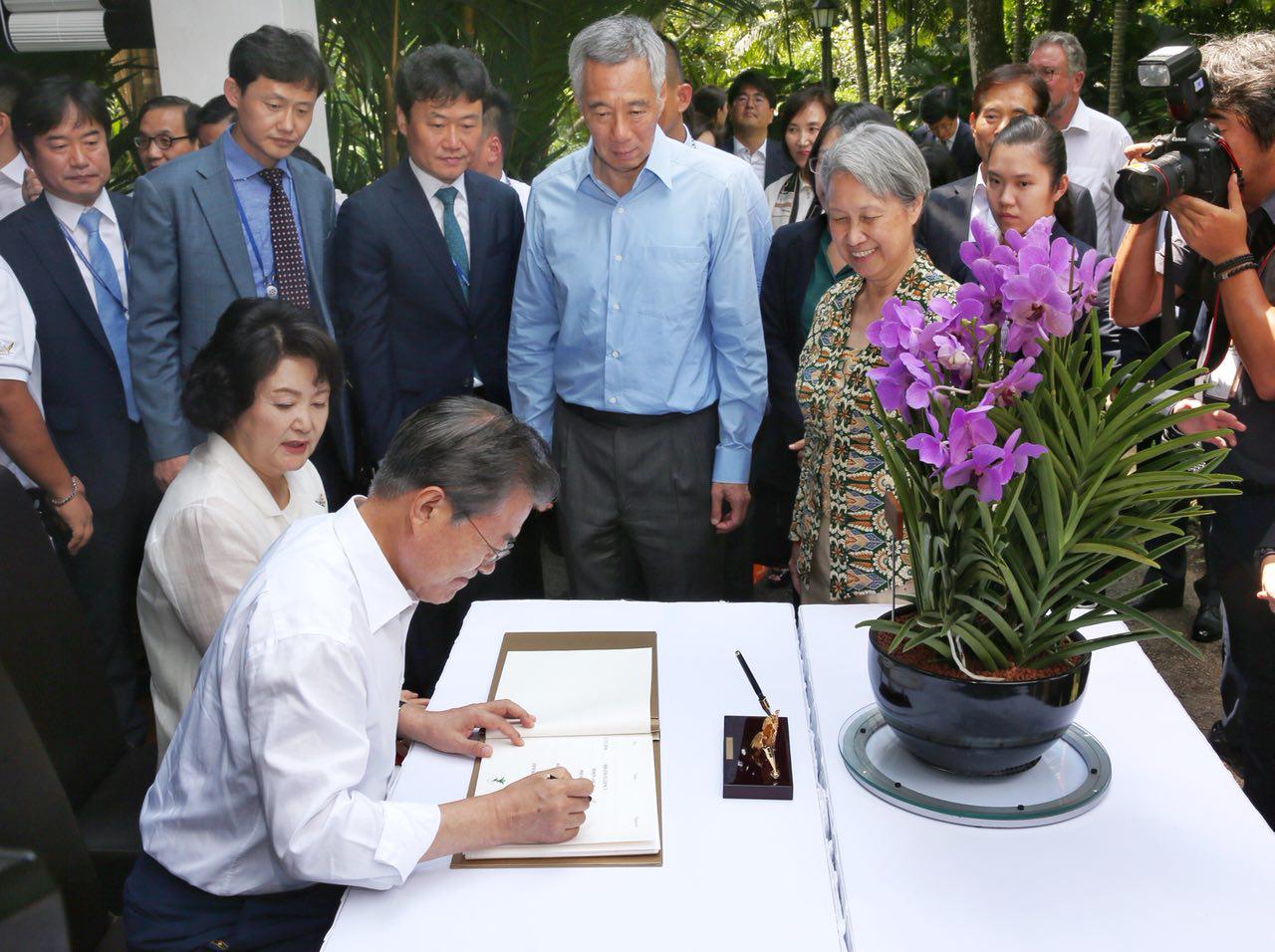 Mr Moon was hosted to lunch by Prime Minister Lee Hsien Loong at the Botanic Gardens, where he had an orchid named after him and his wife, Madam Kim Jung-sook.