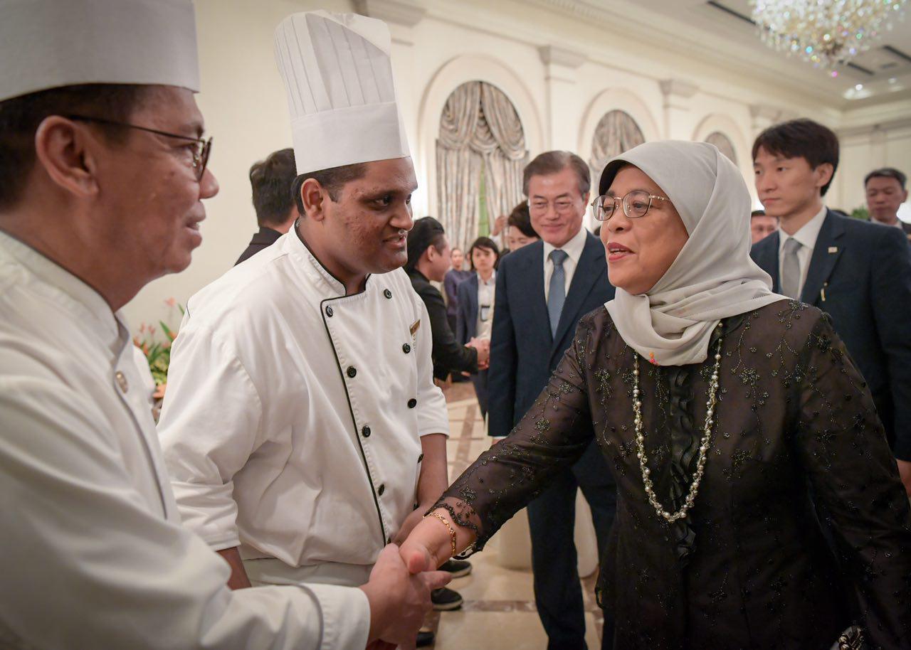 The dinner capped a busy day for Mr Moon, who received an official welcome at the Istana and called on Madam Halimah in the morning.