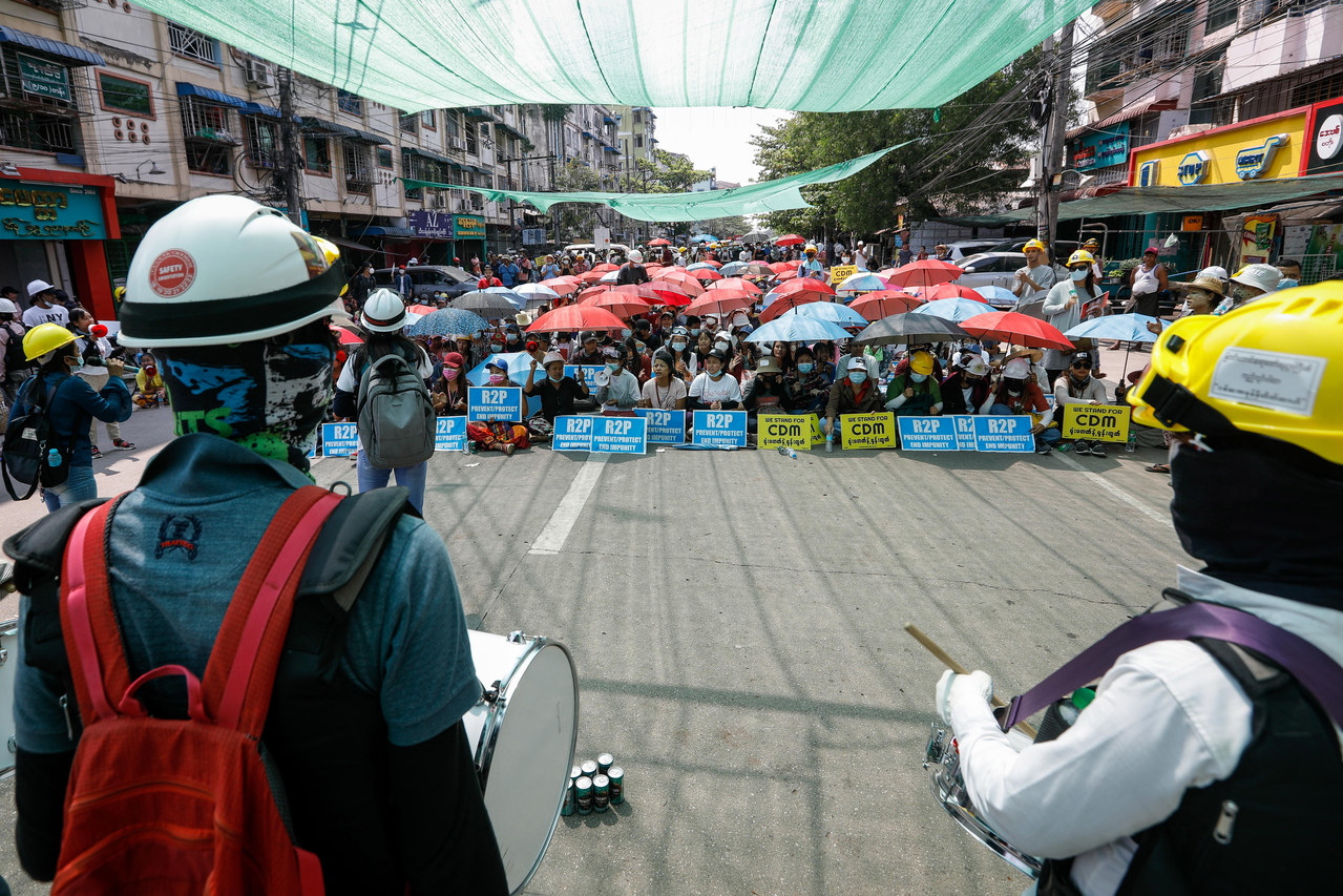 Demonstrators gathering for a protest against the military coup in Yangon on March 18, 2021.