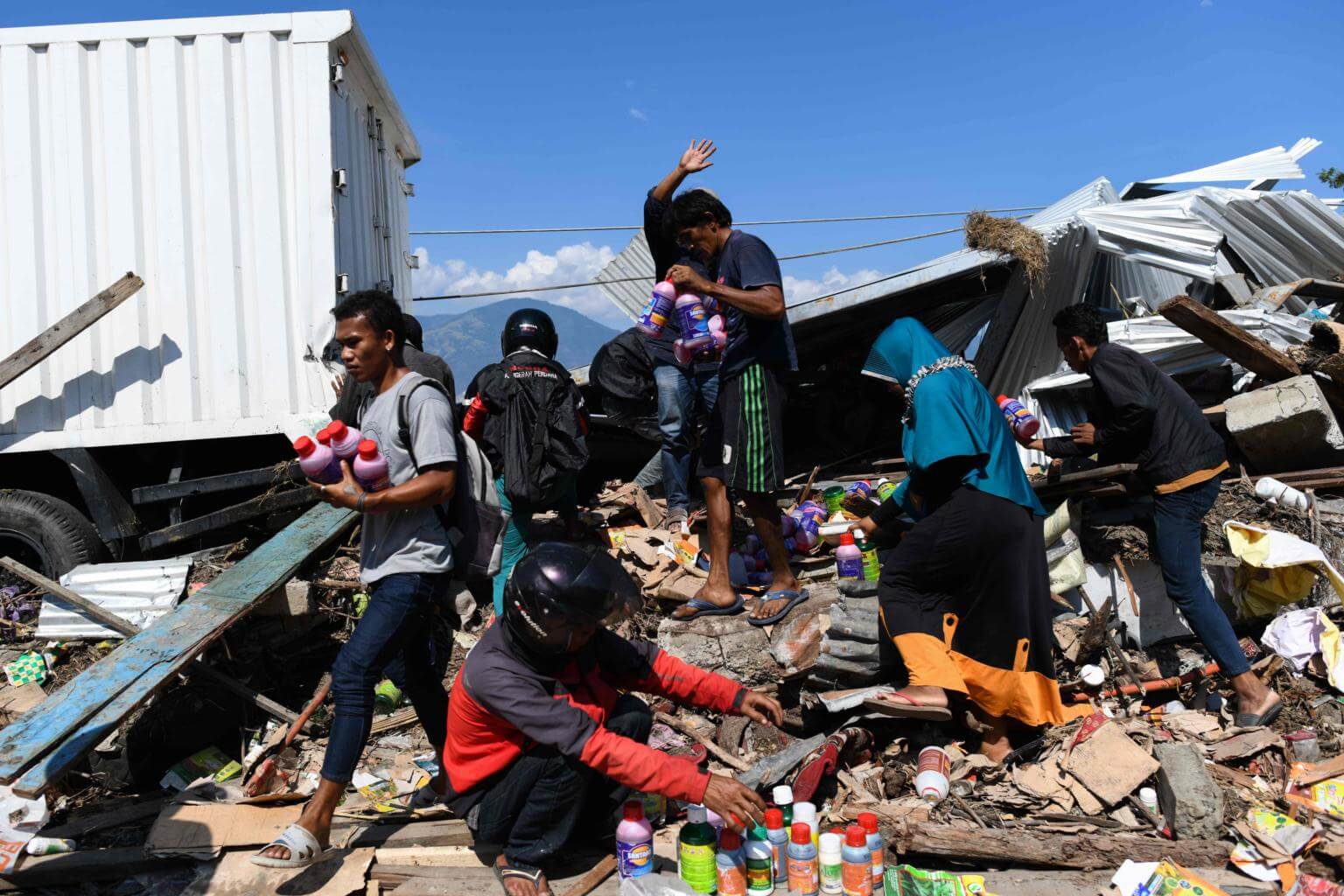 Indonesians salvaging usable items from the debris of a collapsed building in Palu, Central Sulawesi on Oct 1, 2018, after an earthquake and tsunami hit the area last Friday.