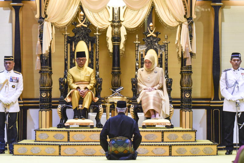The sixth Sultan of Pahang, Sultan Abdullah ibni Sultan Ahmad Shah (left,) and his consort Tunku Azizah Aminah Maimunah Iskandariah on their thrones during their coronation in Pahang, Malaysia on Jan 15, 2019.