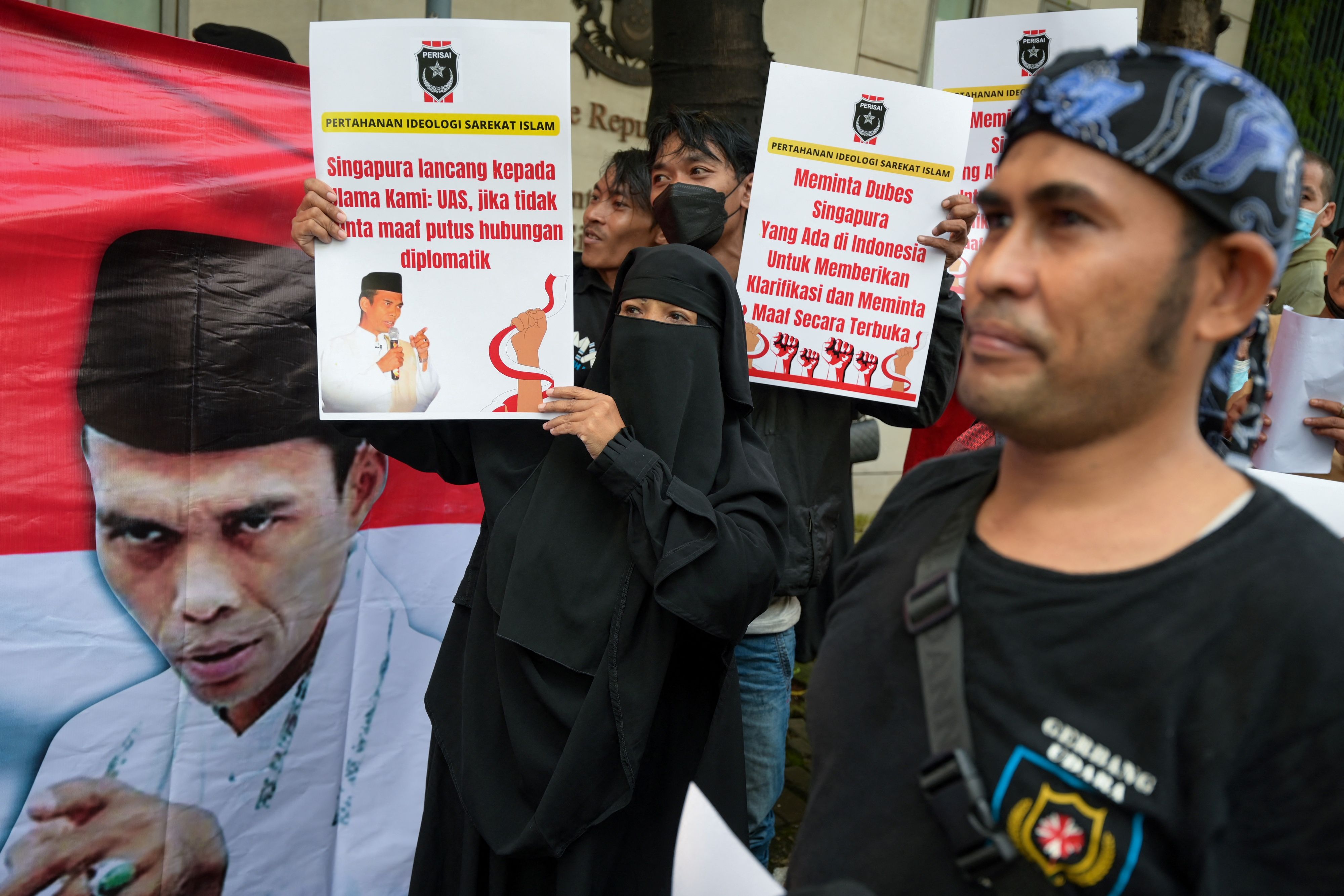 Muslim preacher Abdul Somad supporters hold a protest in front of the Singapore embassy in Jakarta on May 20, 2022.