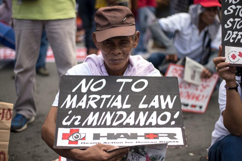 An activist hold an anti-martial law banner during a protest at Malacanang palace in Manila on June 30, 2017.