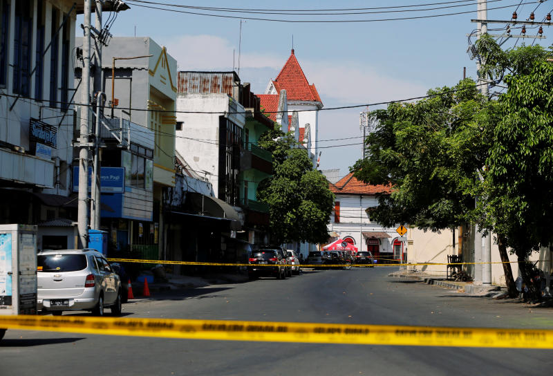 A police line on an empty street following a bomb blast at a police station in Surabaya, Indonesia, on May 14, 2018.