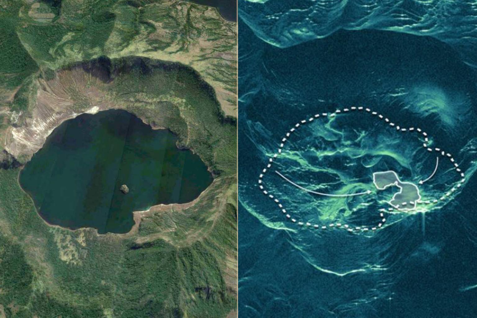 The lake within the Taal volcano has disappeared amid the ongoing volcanic activity. The picture on the left is a Google Maps satellite photo of the lake before the volcanic activity. In the radar image on the right, the dashed line is the lake's former extent; the solid line is the extent on Jan 16, 2020.