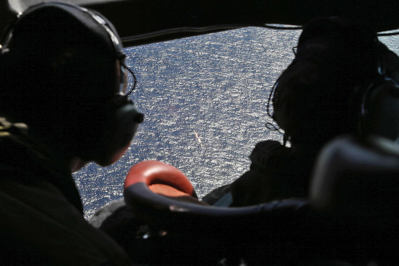 Crew members looking out the cockpit windows of a RNZAF P3 Orion during search operations for the wreckage and debris of missing Malaysia Airlines Flight MH370 in the southern Indian Ocean.