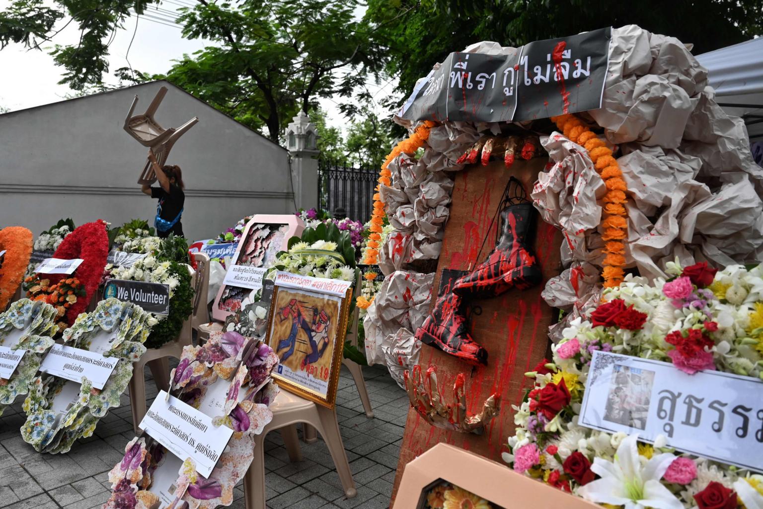 A grisly tableau was erected at Thammasat, with effigies of bodies strung up in trees and laid near the memorial site.