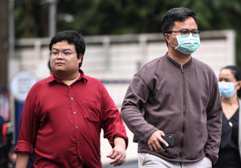 Protest leader Parit Chiwarak (left) and human rights lawyer Arnon Nampa arrive at a criminal court in Bangkok, on Feb 9, 2021.