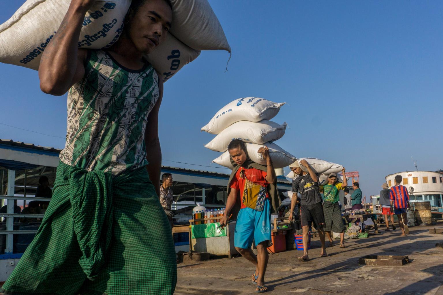 Labourers unload sacks of rice from a ship at a jetty in Yangon, on Feb 3, 2021.