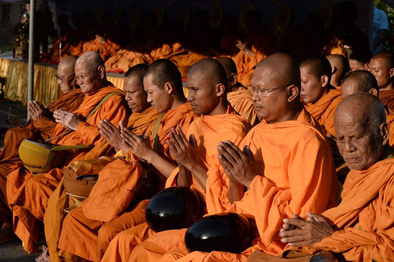 Buddhist monks pray during a ceremony in Narathiwat, Thailand, on Aug 12, 2018. The recycling temple of Wat Chak Daeng is one bright example of recycling for Thailand, one of five countries that account for more than half of plastic in the world's oceans.