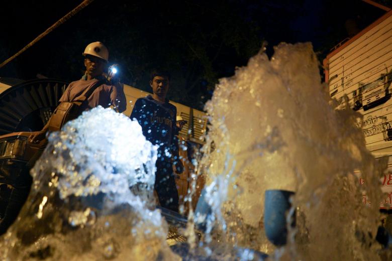 Rescue workers checking on water being pumped out of the Tham Luang cave, on July 6, 2018. The boys will have to be extracted from above if the underground chambers become submerged during the rainy season.