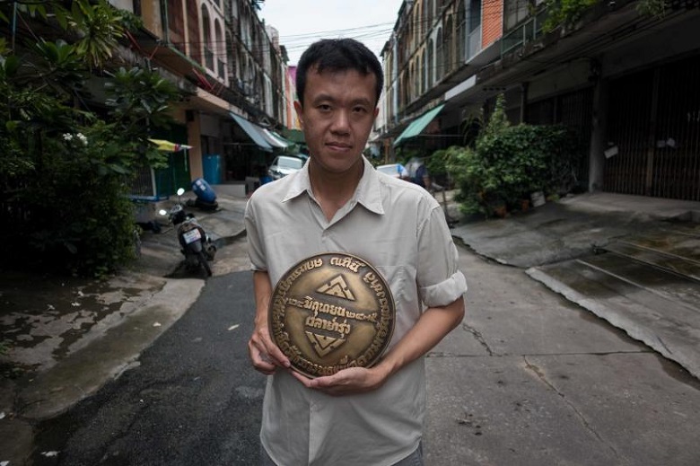Thai dissident Ekachai Hongkangwan with a brass replica of the missing plaque commemorating the year Thailand went from being an absolute monarchy to a democracy in 1932, outside his house in Bangkok, on July 12.
