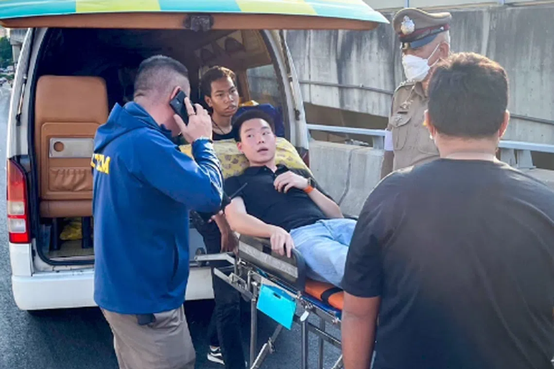 Mr Atthapol Yolsophon sustained minor injuries when his sedan jumped the barrier wall of an off-ramp to Rama lV Road and crashed into the side of the expressway.
