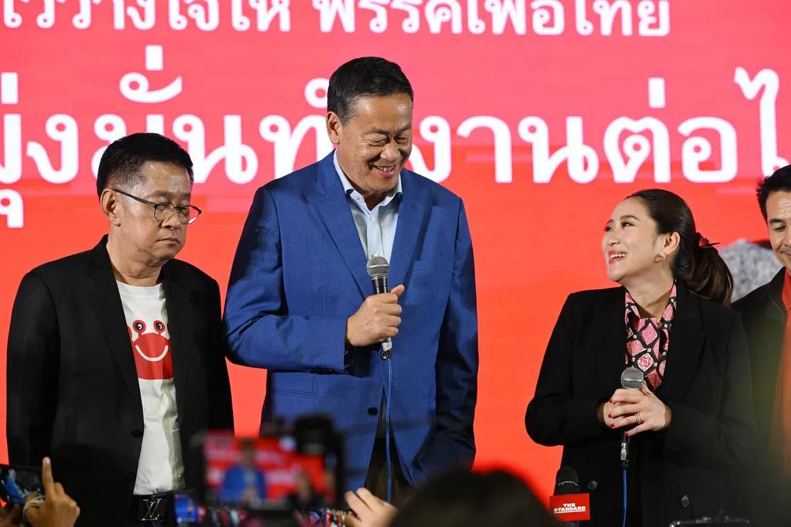 Pheu Thai Party’s Srettha Thavisin (centre) and Paetongtarn Shinawatra (second right), with party secretary-general Prasert Jantararuangtong (left) at theparty headquarters in Bangkok on May 14, 2023. The party won 141 seats, according to Thailand’s election commission.