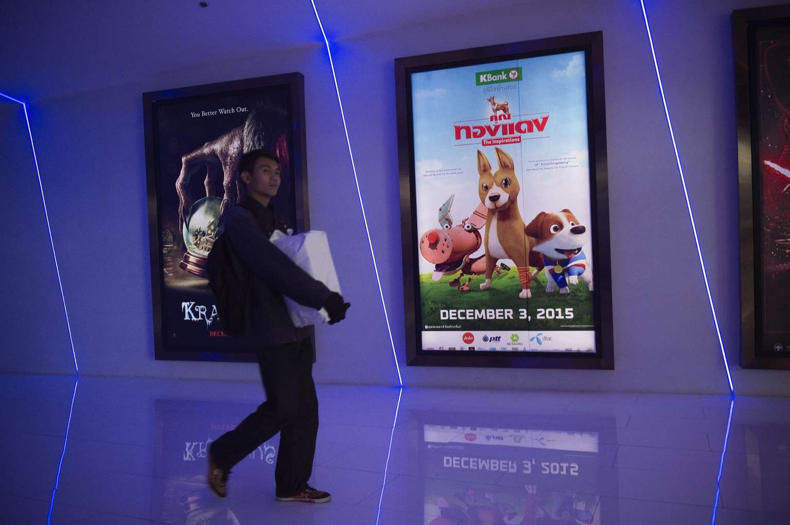A man walks next to a poster (right) for the film Khun Tongdaeng: The Inspiration, based on the Thai King's favourite dog.