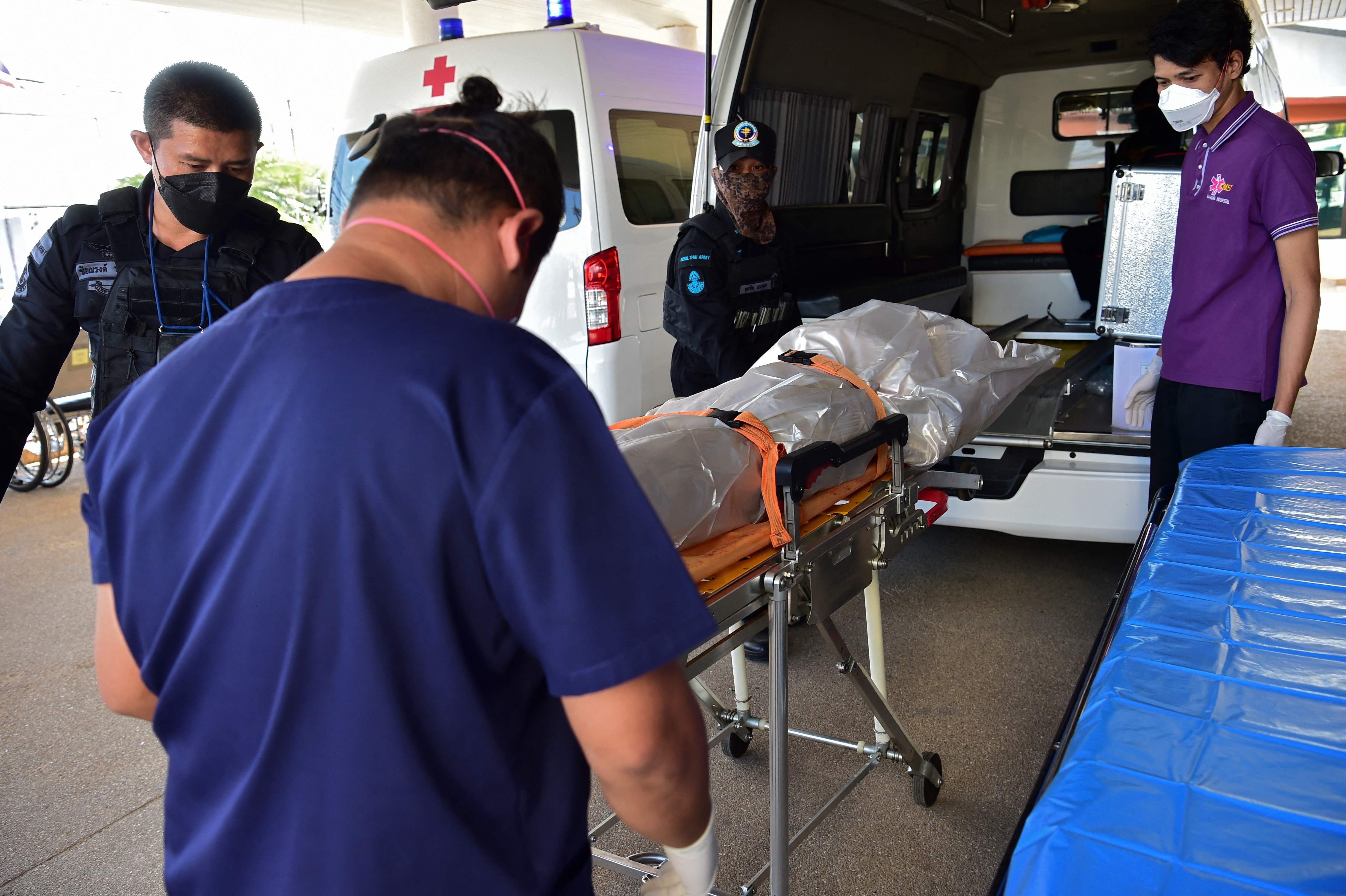 Hospital staff remove the body of a suspected separatist from an ambulance, following an earlier operation in Thailand's southern province of Narathiwat on Jan 29, 2022.