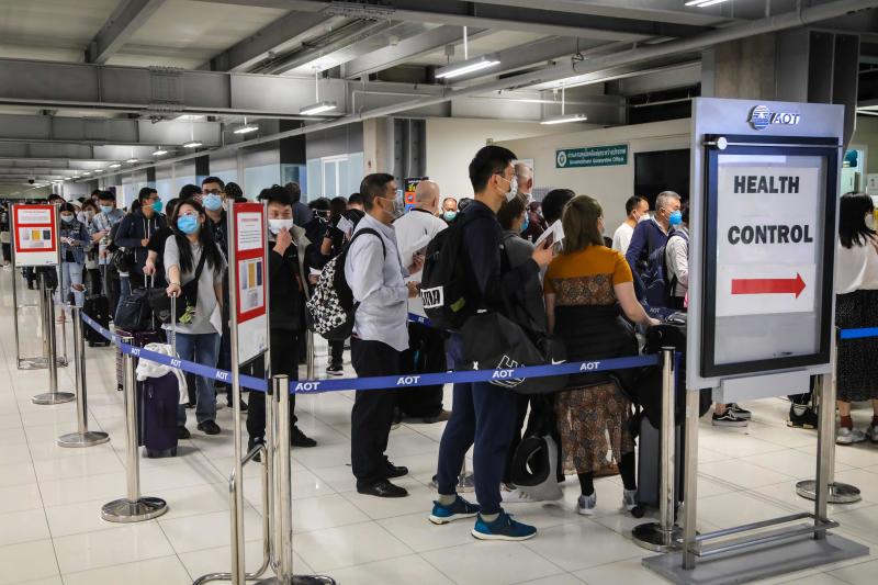 Incoming passengers lining up to have their temperatures taken and health assessed at a checkpoint at Suvarnabhumi Airport in Bangkok, on March 9, 2020.
