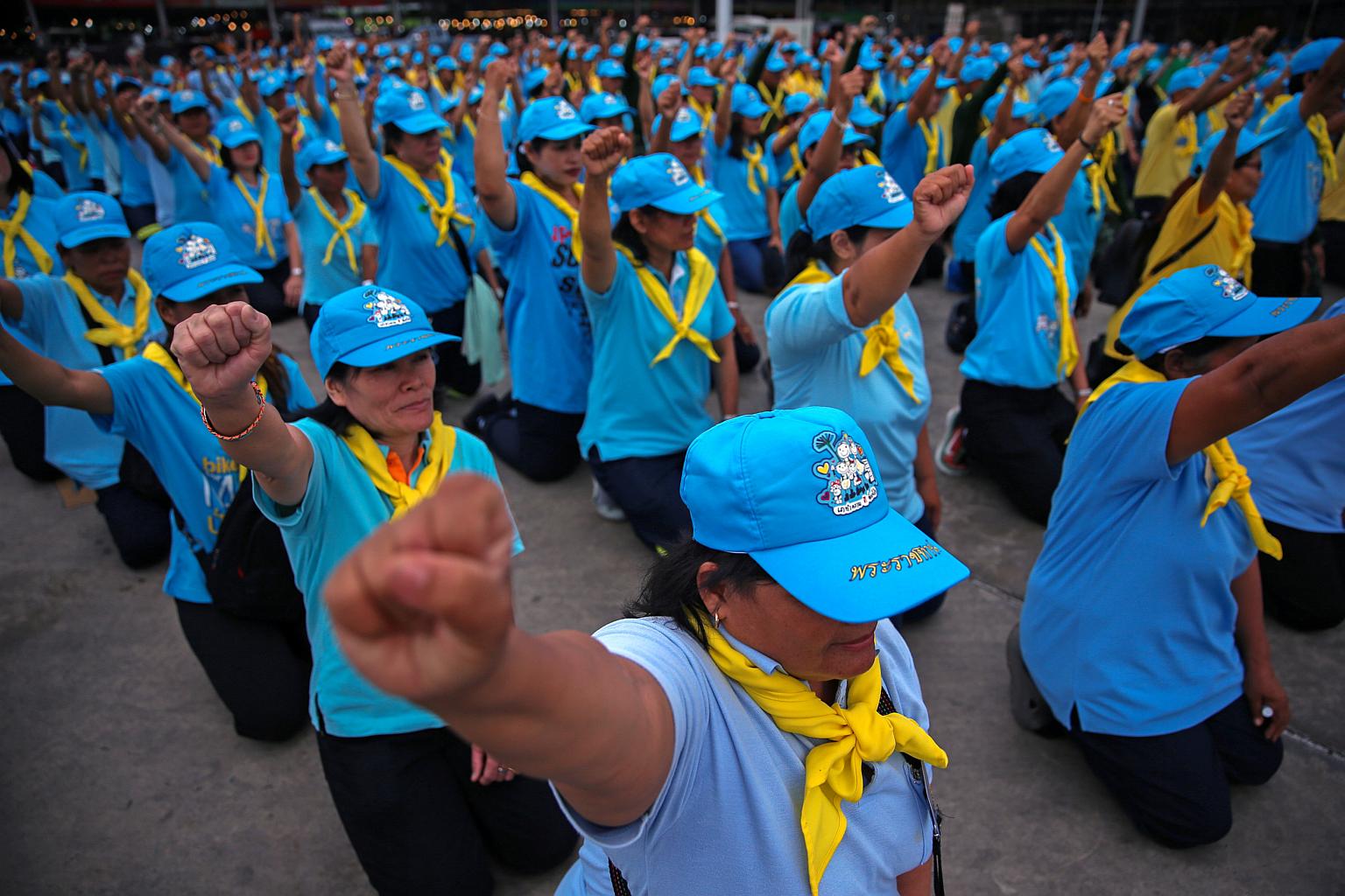 Volunteers of the Thai King in blue caps and yellow foulards shouting slogans before the start of a cleaning program at a market in Bangkok, Thailand, on Aug 8, 2018.