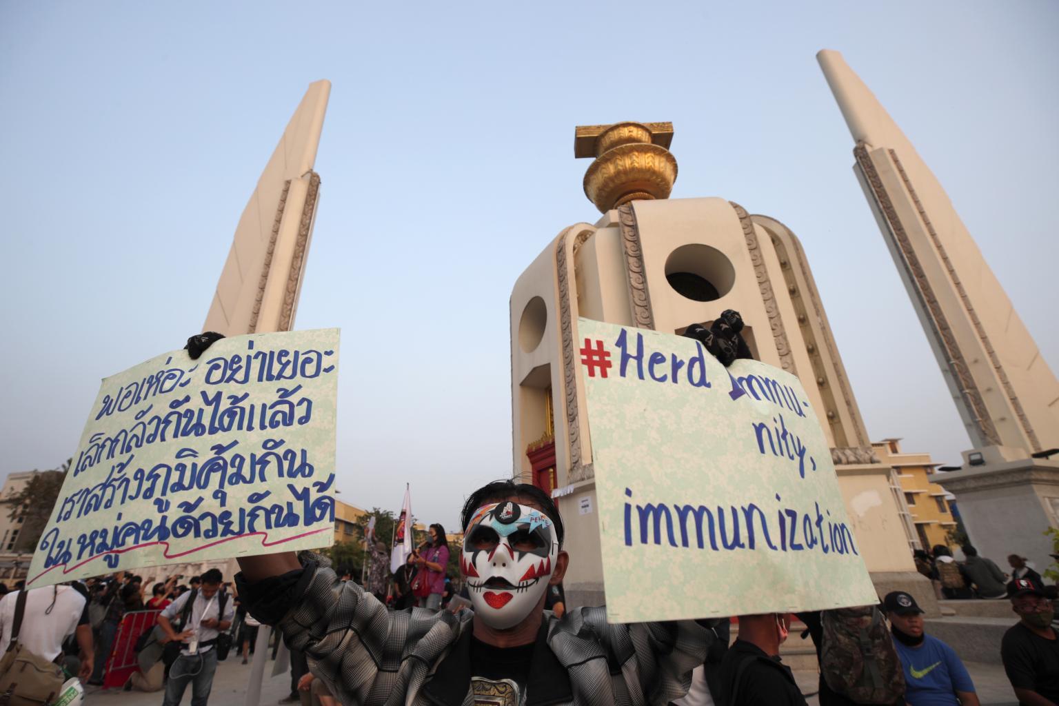 A Thai pro-democracy protester at the Democracy Monument in Bangkok, on Feb 13, 2021.