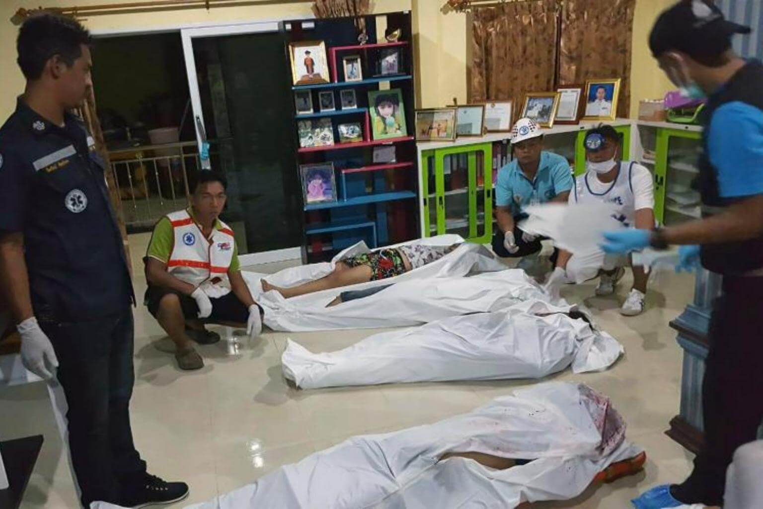 Thai rescue workers and a forensic police officer inspect bodies of a Thai family apparently murdered by gunmen at a house in the Krabi province, southern Thailand on July 11, 2017.