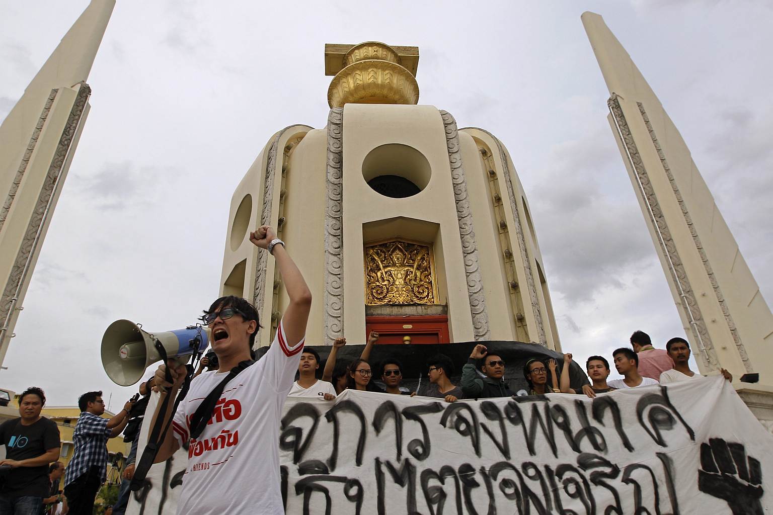 Thai pro-democracy activists shout slogans as they hold a banner reading: 'Dictator Must fall, May Democracy Prosper' during a rally calling to restore democracy at the Democracy Monument in Bangkok, Thailand, June 25, 2015.
